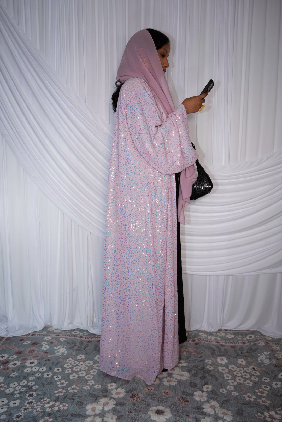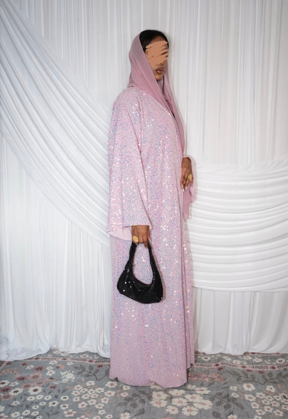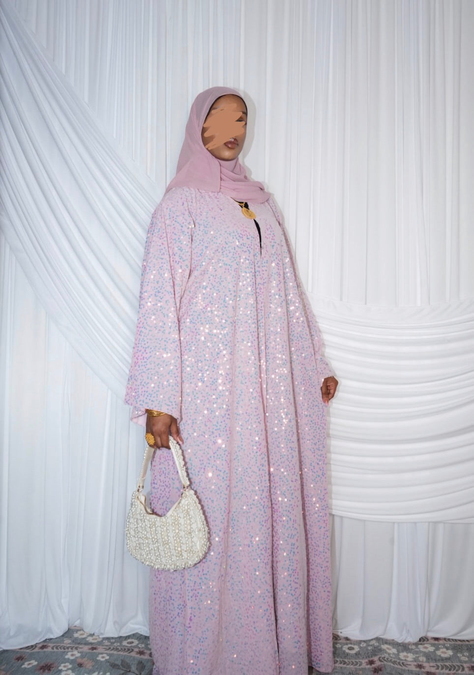 Open abaya : soft pink iridescent sequin Abaya, matching chiffon hijab