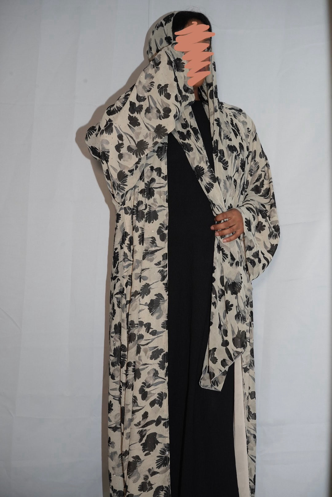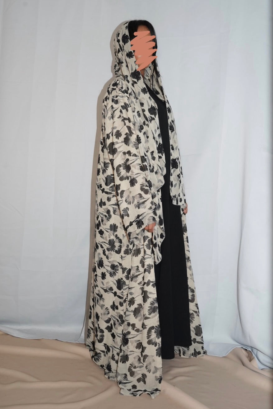 Printed double chiffon Abaya and with matching Hijab. Rhinestone Embellished