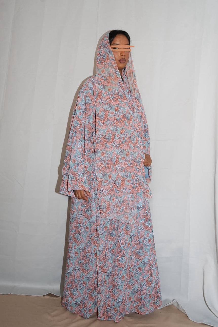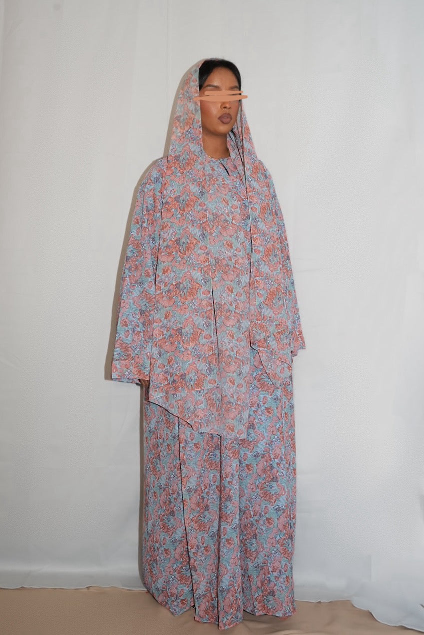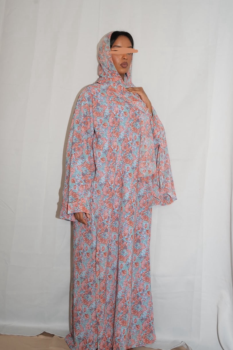 Floral print double chiffon abaya with matching hijab