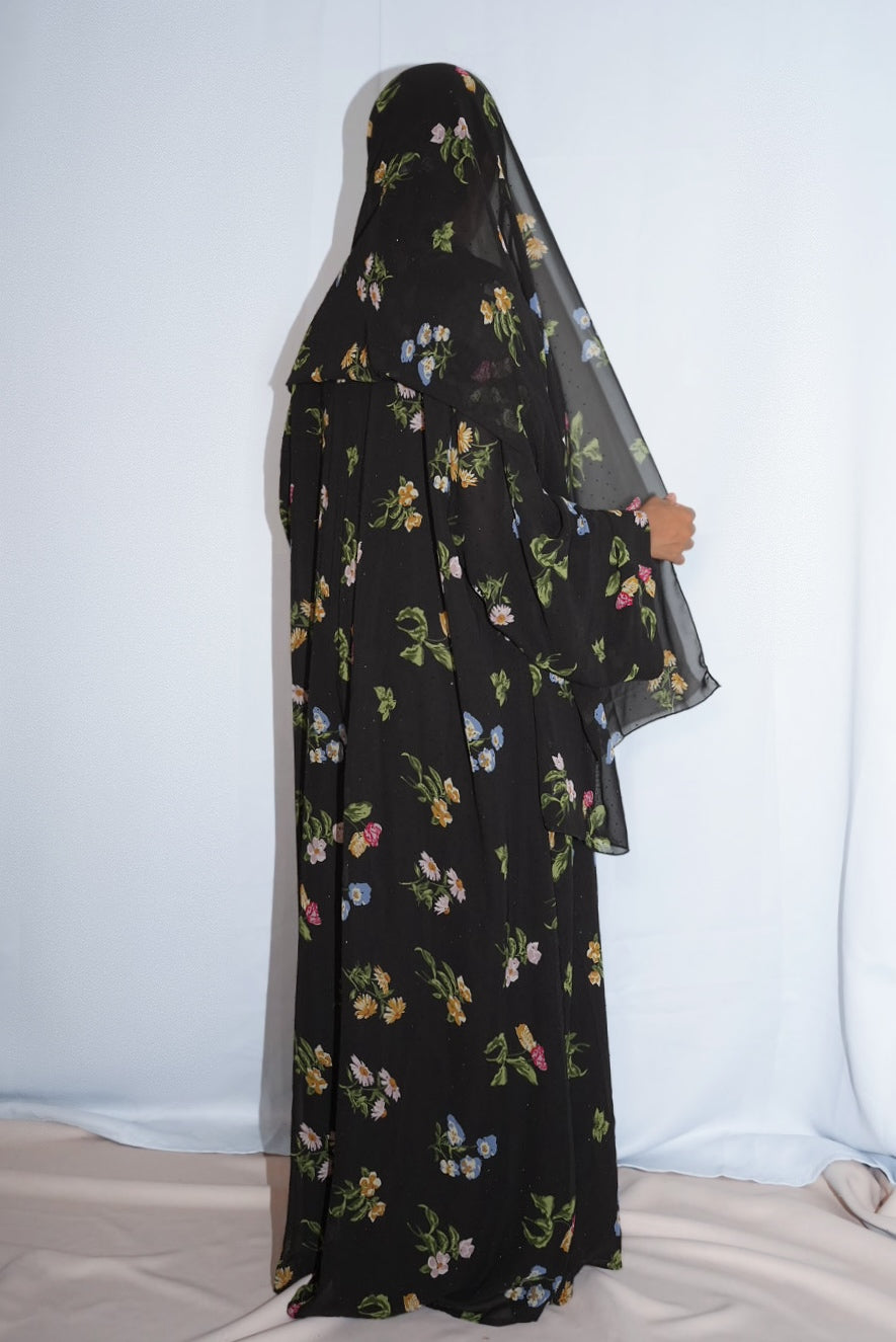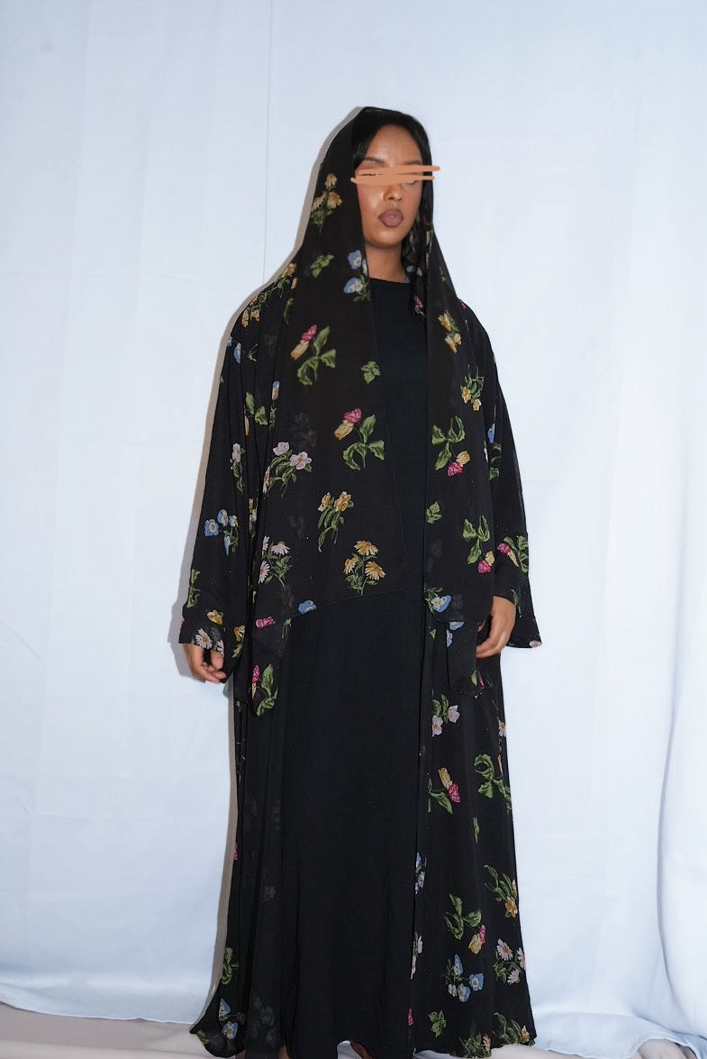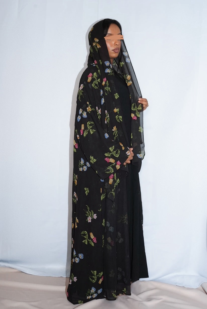 Floral Printed chiffon abaya with cotton underlining, with matching Hijab. W/ Rhinestones