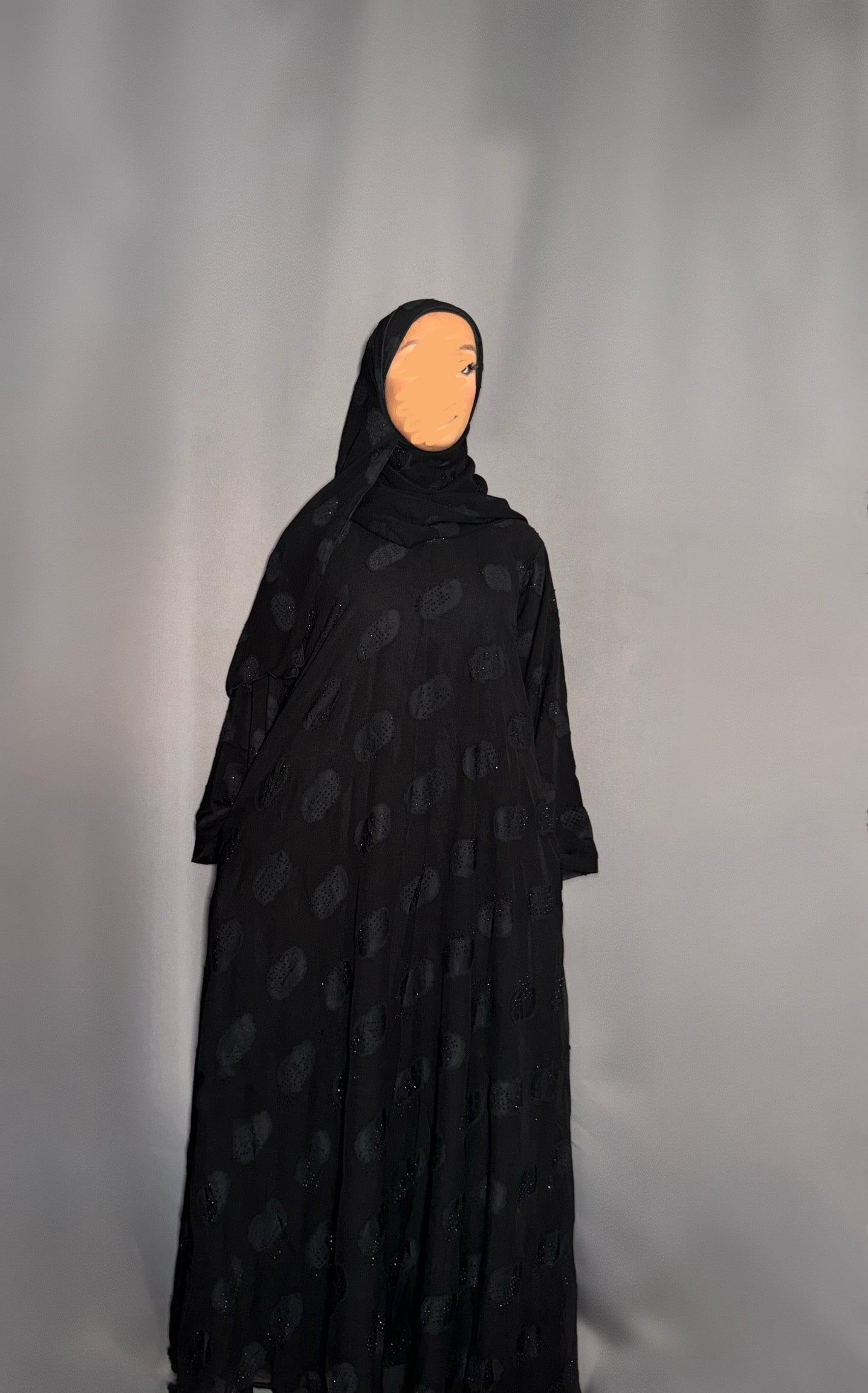 Closed, black chiffon abaya with cotton underlining. Rhinestone embellishment. Comes with a matching hijab.