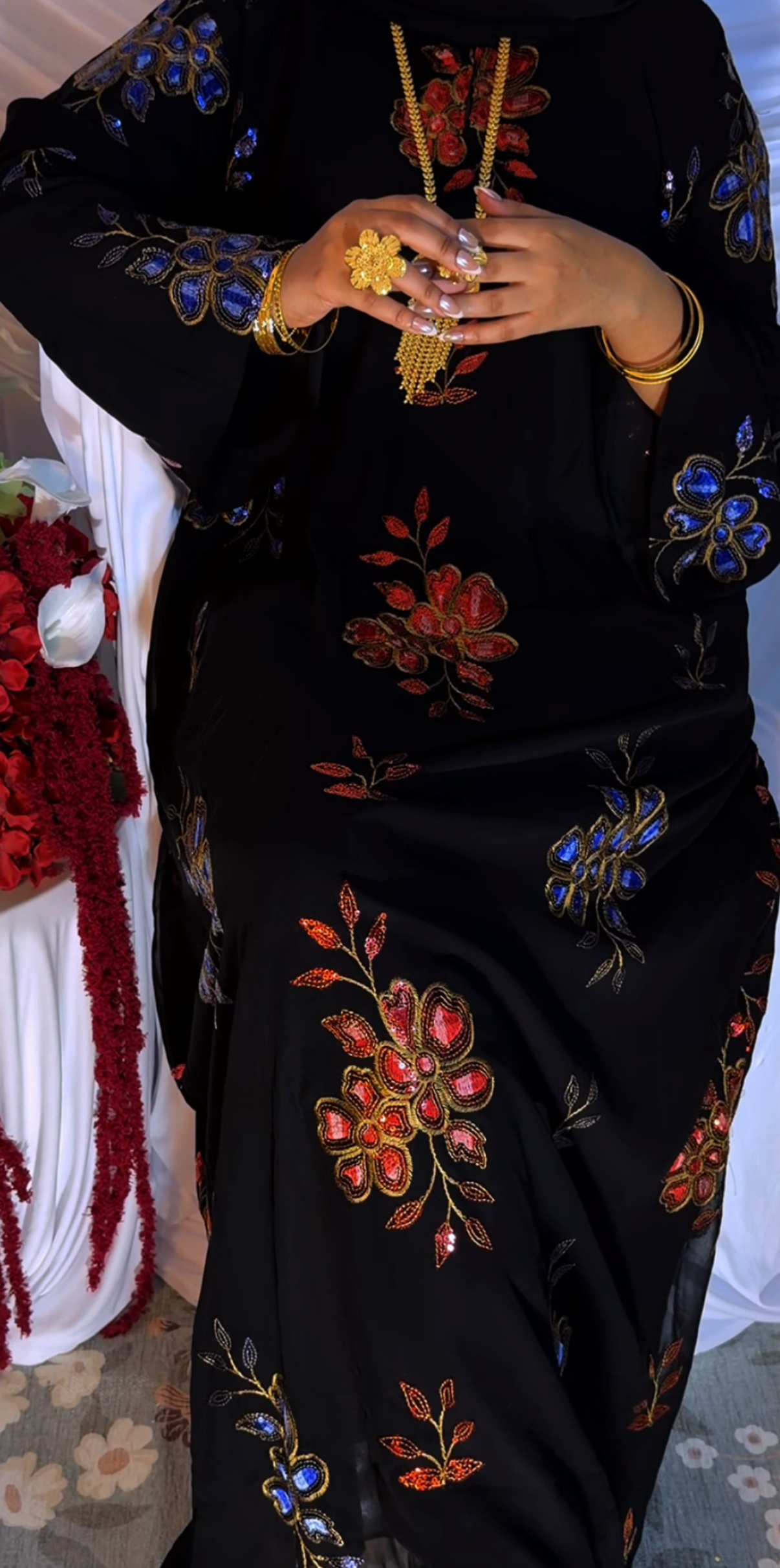 Closed abaya : multi color , full sequin and embroidered floral pattern abaya, with plain black hijab