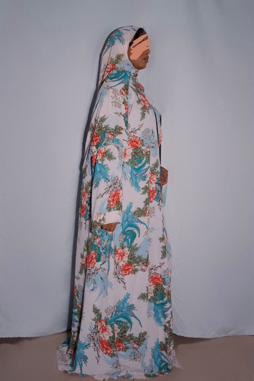 floral double chiffon abaya with rhinestones, comes with matching hijab