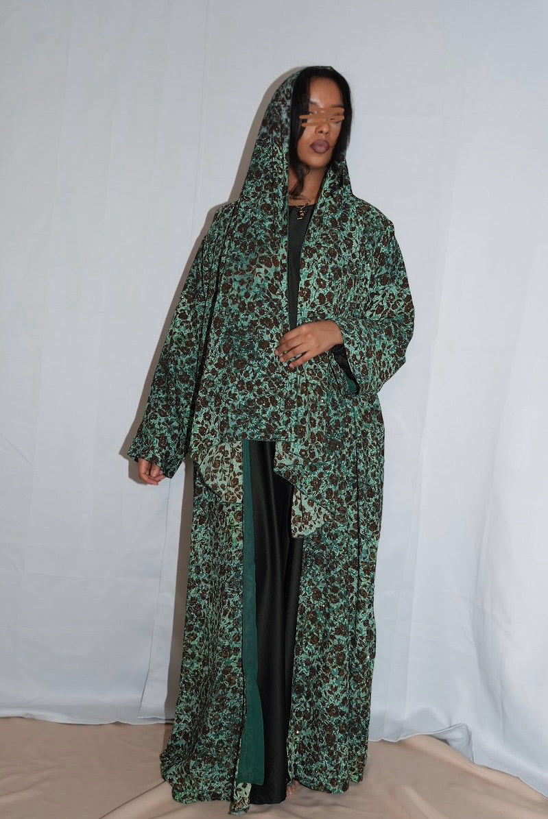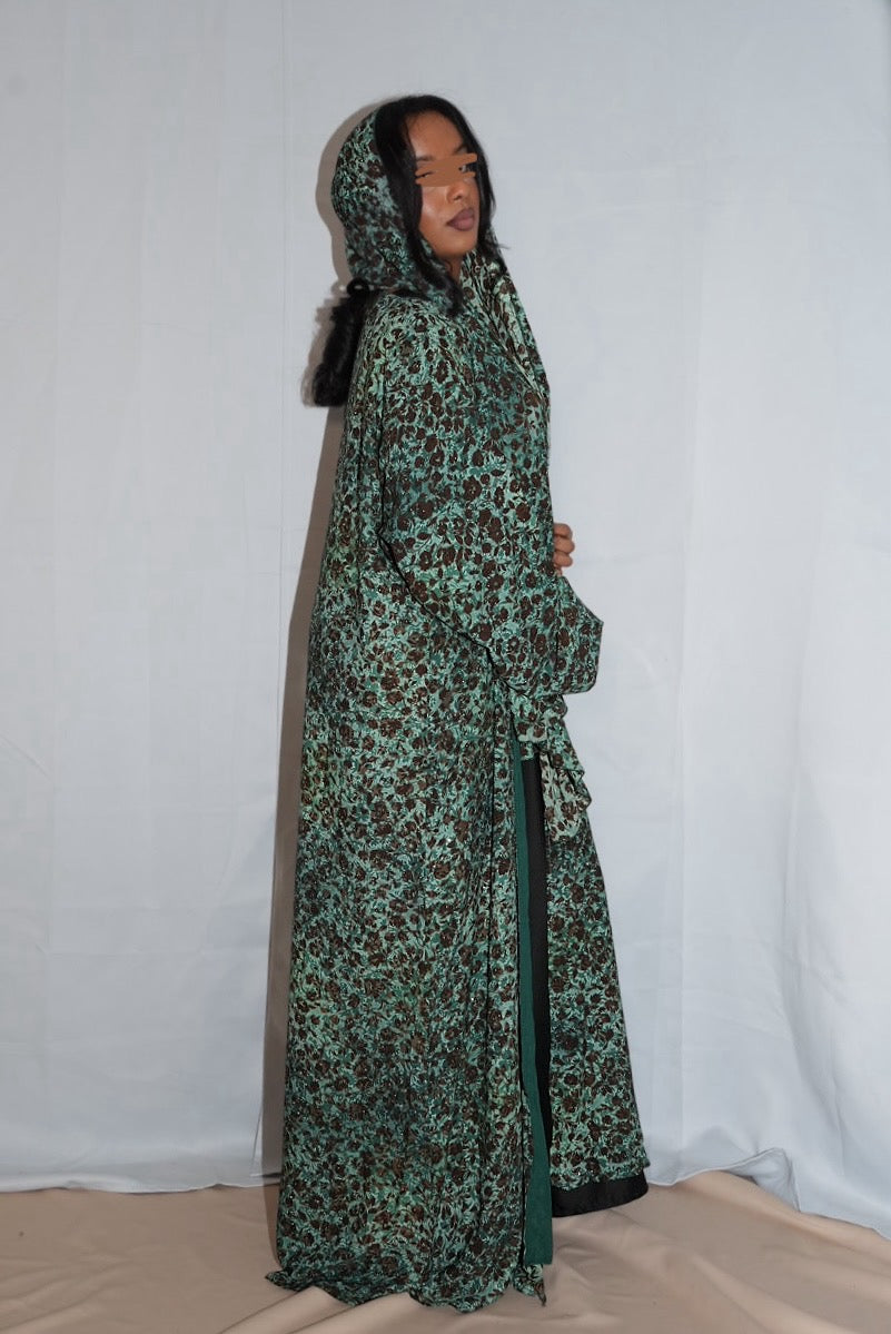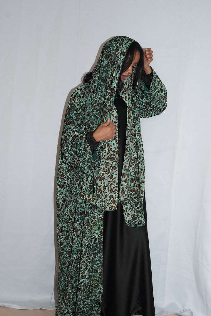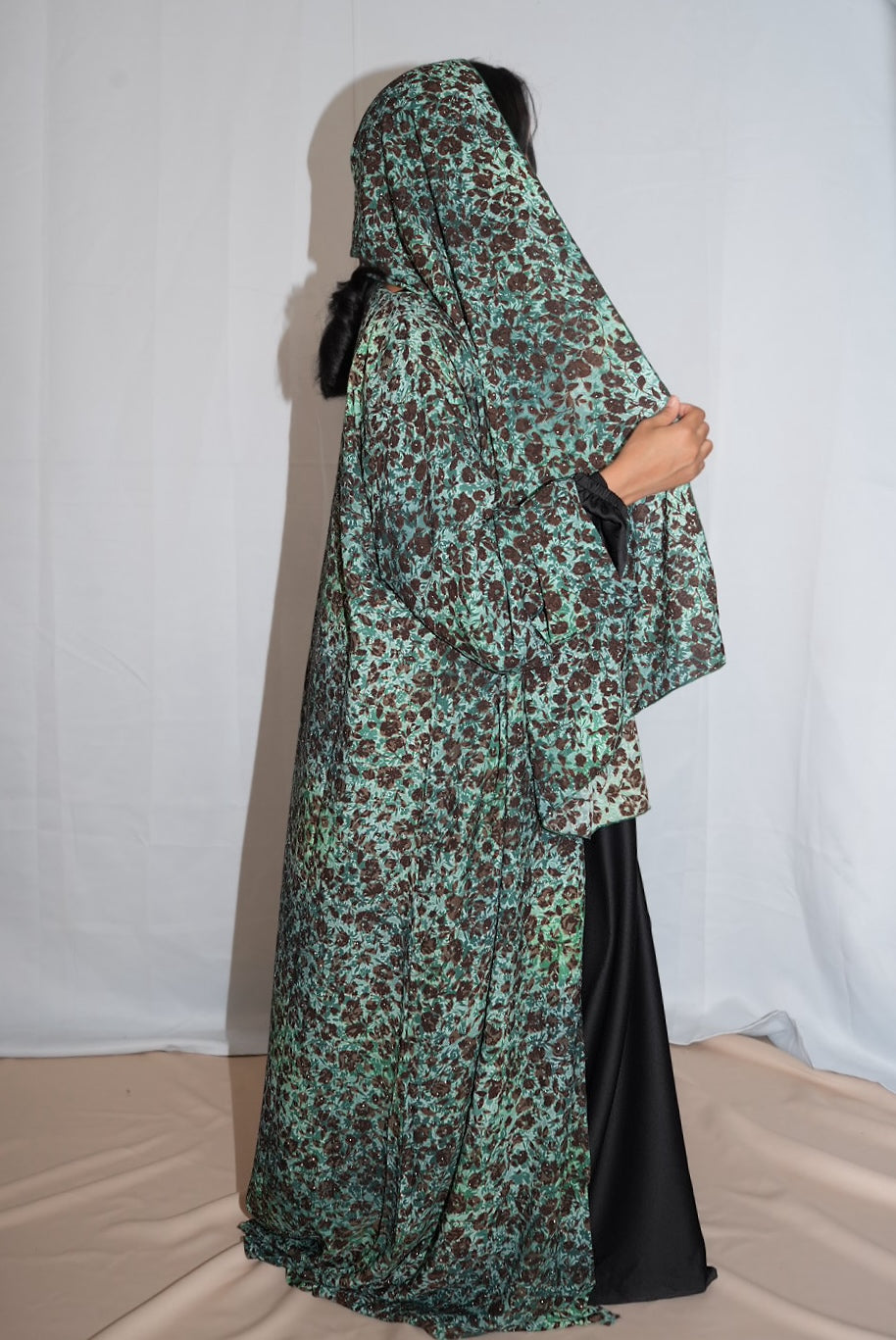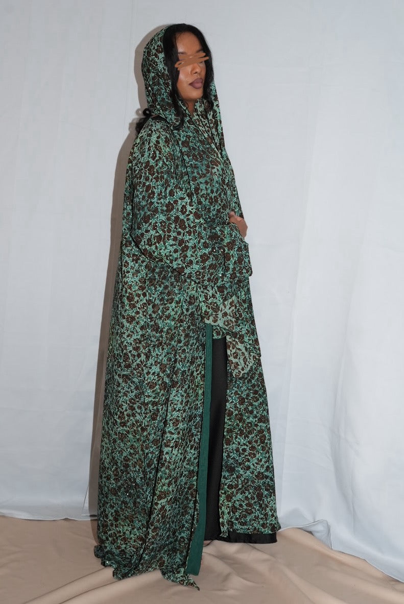 Printed crepe abaya, with rhinestone embellishments and matching Hijab.