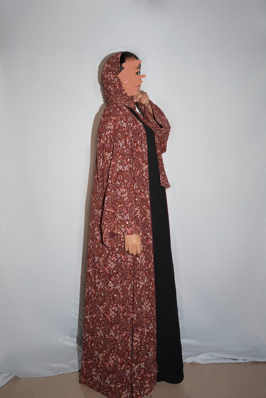 Floral Printed double chiffon Abaya and with matching Hijab. Golden foil floral details.