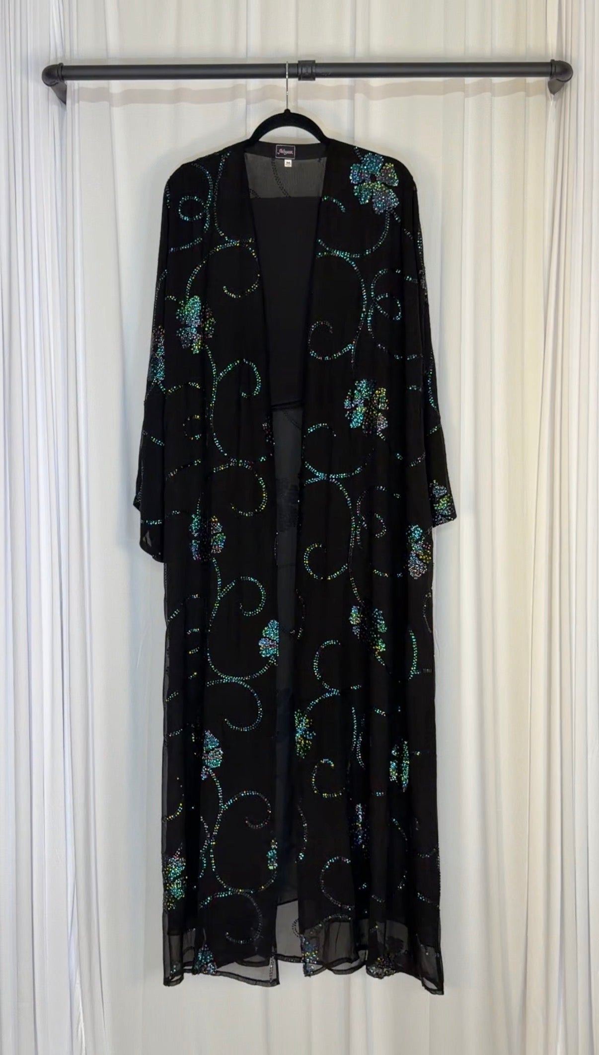 Open abaya : blue , full sequin floral pattern abaya, with plain black hijab