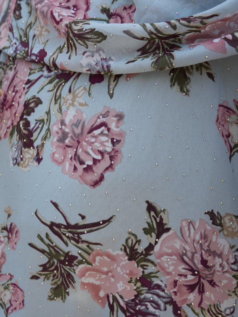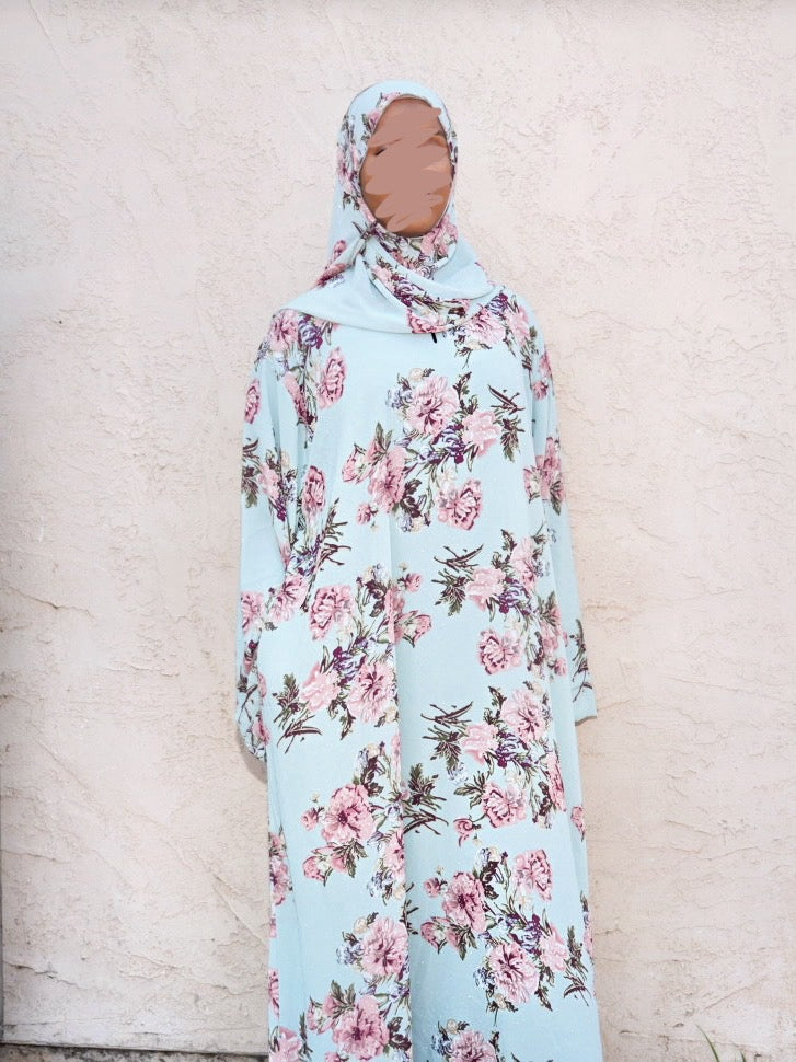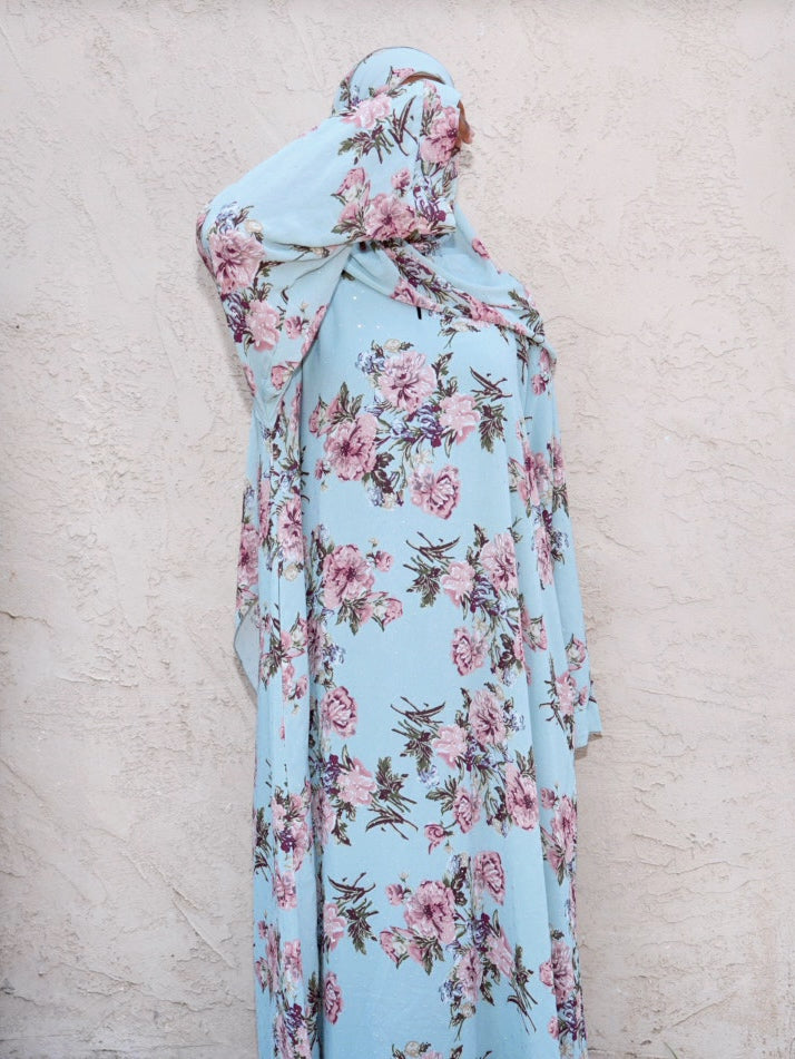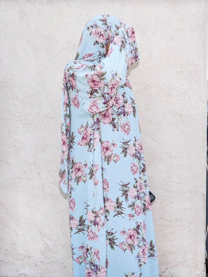 Floral Printed double chiffon Abaya and with matching Hijab. Rhinestone embellished.