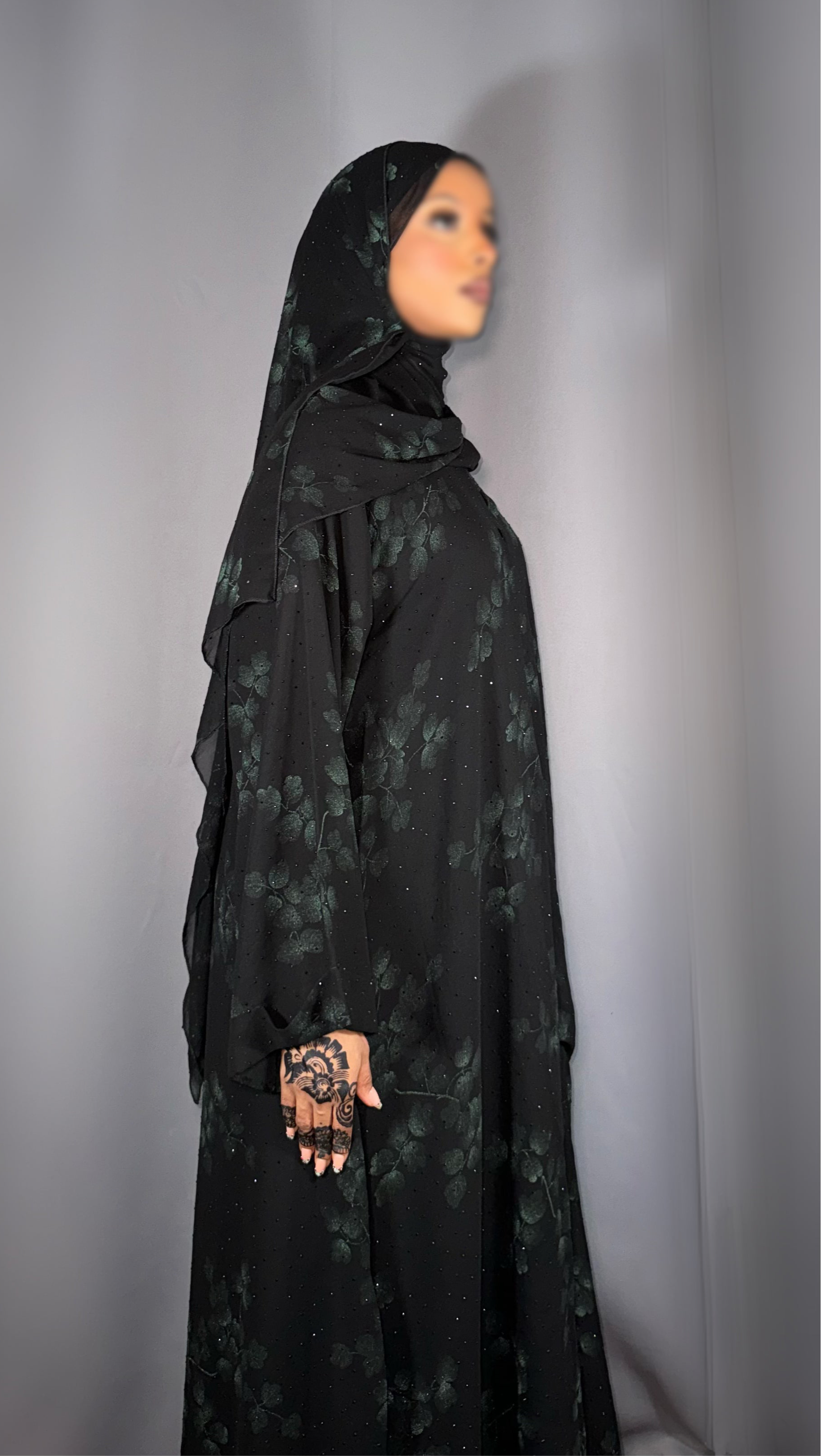 Black abaya & hijab with dark green shimmer print and rhinestone embellishment.
