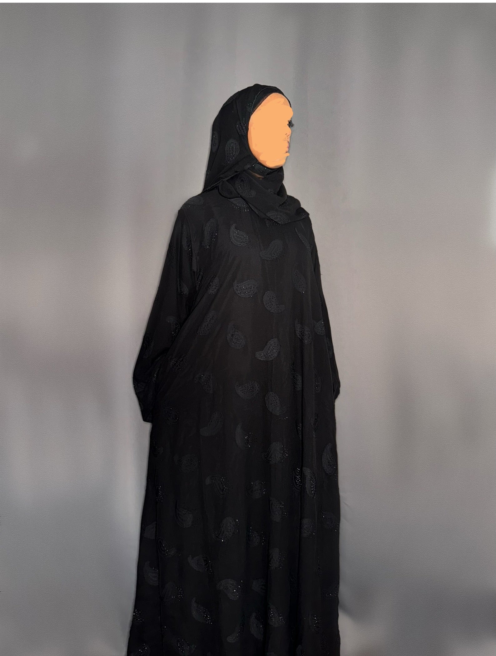 Closed black abaya and hijab with rhinestone embellishment & pockets