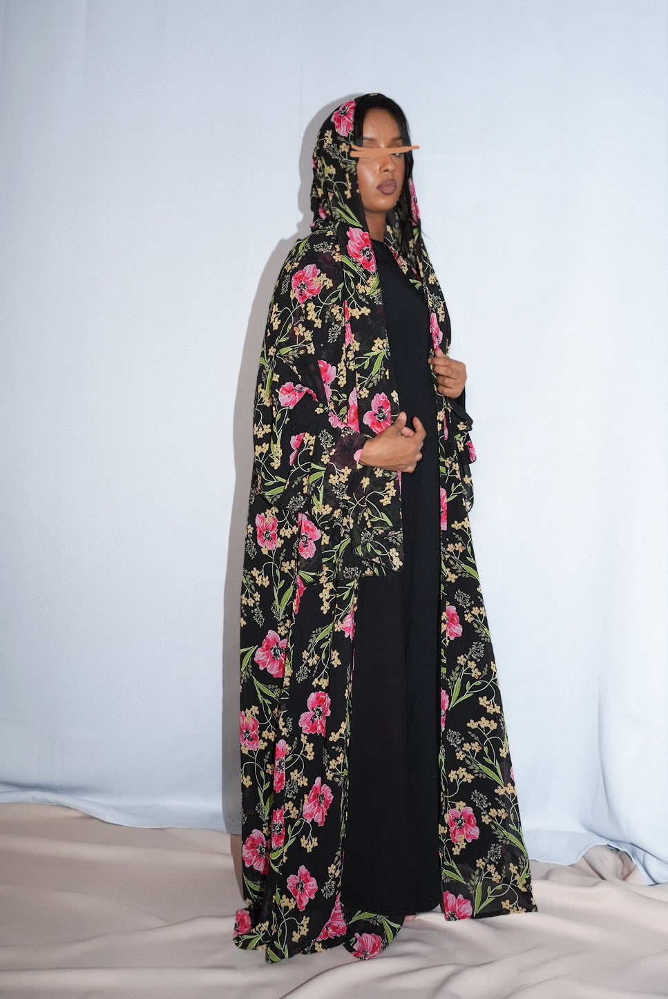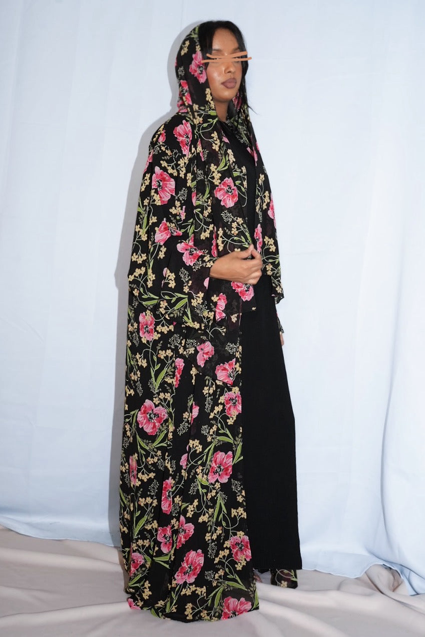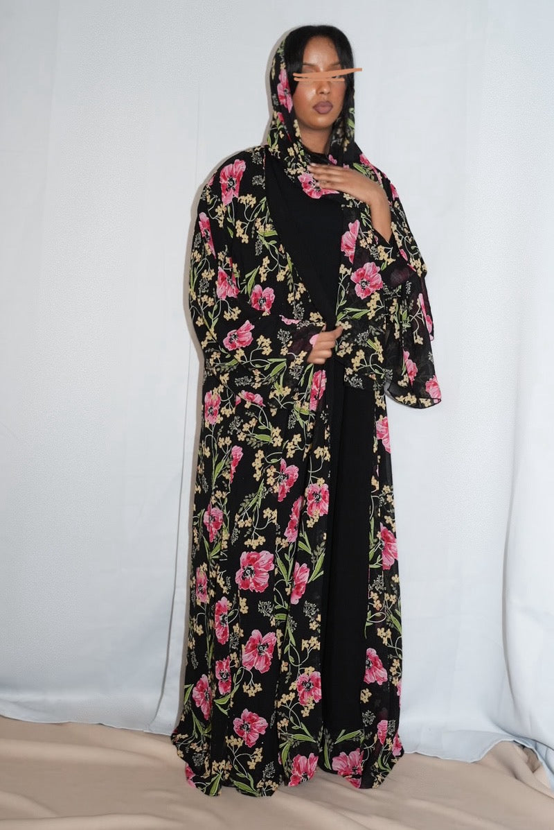 Floral Printed chiffon abaya with cotton underlining, with matching Hijab. W/ Rhinestones