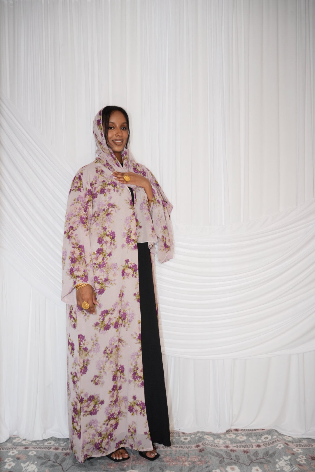 Rhinestone Floral printed chiffon Abaya with matching chiffon hijab.